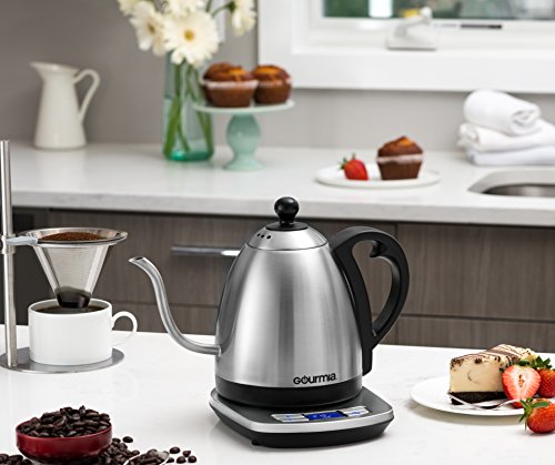 Studio : Gourmia Publisher : Gourmia Product Description Make your mornings easier with the convenience and comfort of making your morning beverages and meals at home. Get out of long cafe lines and get to work on time. The Kettle Commander from Gourmia turns your home and kitchen into your very own cafe, saving you time and money. Quickly make hot coffee, soothing tea, hot cereal and savory soup in a few simple steps. QUICK AND EASY TO USE! Have perfectly hot water ready in a matter of minutes with the push of a button. Temperature control functions and an advanced LCD display built into the base allow you to easily change the temperature of your water so that it's perfect for your coffee, tea, hot cocoa, oatmeal or instant soup. SLEEK GOOSENECK DESIGN Your perfect cup of pour over coffee is served! The sleek gooseneck spout is specifically designed to control the water flow during your pour. Evenly and precisely saturate your coffee grounds to extract the best flavor from your beans. ECONOMICAL AND ENERGY SAVING Say goodbye to coffee shop lines! With this electric kettle you can make your very own cafe creations in the comfort of your very own home, saving you time and money. Automatic shut off functions preserves your electricity and lowers your utility bill. FUNCTIONAL AND SLEEK Gourmia fuses function with style to create an effectively beautiful tea kettle. Sleek stainless still is accompanied by efficient buttons and features to make your mornings, afternoons and evenings trouble free and enjoyable. FEATURES AND FUNCTIONS: ? Stainless Steel ? Digital Screen Display ? Fahrenheit/Celsius ? Temperature Control Button ? Gooseneck Spout ? 120 Volt ? ETL Listed A useful manual is included with useful instructions to help guide you through the functions and features as well as step-by-step instructions for assembly, cleaning and maintenance of your appliance. 0