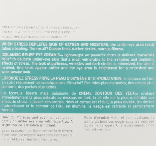 Deep lines, dark circles and under-eye puffiness due to stress-related oxygen and nutrient depletion... Sound familiar? Icelandic Relief Eye Cream delivers immediate relief to delicate under-eye skin. Puffiness, wrinkles and dark circles are minimized and skin is revived with a blend of soothing nutrients. Counteract the aging effects of stress while optical diffusers help to soften fine lines and brighten the eye area for a refreshed and wide-awake look. Vitamin K increases circulation to help diminish dark under-eye circles. Anti-aging rice peptides help firm skin by destroying the enzymes that break down collagen and elastin. Orange peel helps reduce puffiness. Cotton powder fills fine lines and acts as an optical diffuser to downplay wrinkles and dark circles. Icelandic kelp helps revitalize skin and fight inflammation.Feature