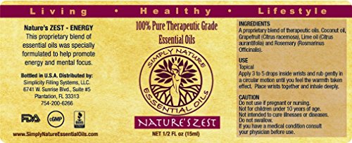 - NATURE'S ZEST: Our Nature's Zest blend was designed to stimulate your senses and energize your day through topical and aromatherapy use. This proprietary blend of essential oils was specially formulated to help inspire your day by stimulating your creative mind. Dilution is not suggested or required.