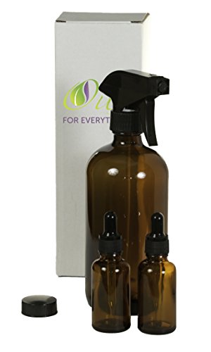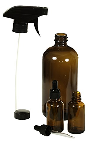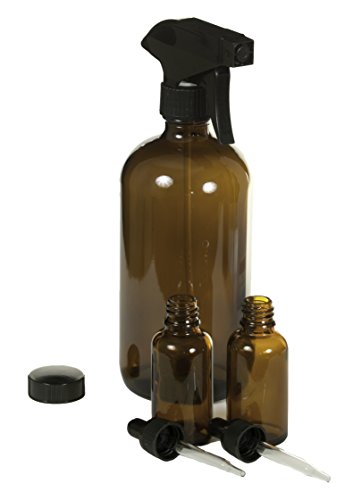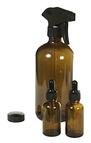 INCLUDES: 1 - 16 oz glass amber spray bottle with spray nozzle & 2 - 30 ml dropper bottles