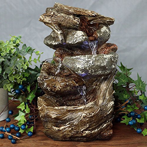 This indoor, lighted, water fountain with an electric pump is the perfect table accent with its carved look, three rock tiers between a large rock base and small log top. The soothing sounds it creates will have you relaxing in no time! Constructed of a durable, resin material for ease of placement, and the electric pump enables the gently flowing water to flow from the top tier all the way down to the bottom pool where it then recirculates back through the fountain. The fountain features padded feet, natural coloring and an LED light.