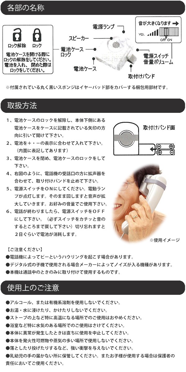 | 耳が遠くなったお年寄りにとって、電話の声は特に聞き取りにくいもの。受話器の耳あて部に装着するだけで、相手の声が大きく聞こえ、会話もスムーズにできます。工場など騒音の多い場所にもおすすめです。 |