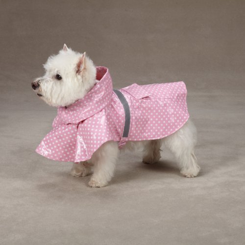 This polka dot rain jackets keep dogs dry and comfortable during the rain. These dog raincoats feature a fashionable polka dot design. Waterproof jacket features a drawstring hood, rear leg straps, an adjustable waist strap and a reflective stripe on back to improve visibility at night. Each is shipped in a polybag with a hanger and hangtag. Made of 50 percent PU and 50 percent polyester. Available in pink color. Hand wash in cold water. Line dry. Comes in large size and it is fit for australian shepherd, border collie, bulldog, dalmatian, standard schnauzer breeds. Measures 20-inch length.Feature