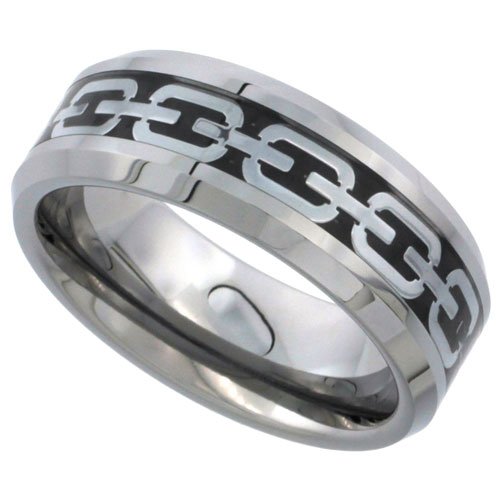 - Title : Tungsten Ring 8 mm Flat Wedding Band Silver Chain Link Inlay Beveled Edges, sizes 9 to 13.5