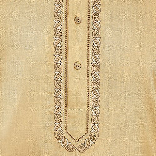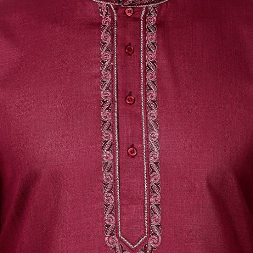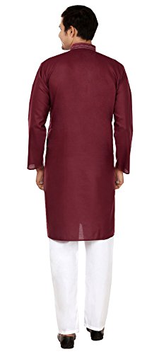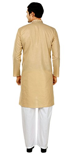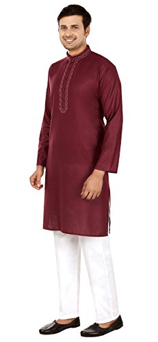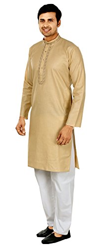 Binding : Apparel Product Description Kurta pajama set with elegant embroidery around neck in silk cotton fabric, ethnic men's wear from India. Loose comfortable fitting makes it a great wear. These kurtas are worn in both summer and winter. Comes with complimentary free size white trouser (pajama) in soft fabric with drawstring in waist. Can be hand washed and machine washed.The Kurta is a knee length shirt, which is worn, mostly in white or pastel colors. Pajama is a lightweight drawstring trouser which is traditionally white or Light Brown in color. Highly comfortable and eminently suited to all climatic conditions, its use is widespread throughout the Indian subcontinent. Kurtas are often worn with jeans.Please check the measurement as per information below before you order.