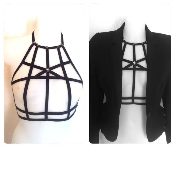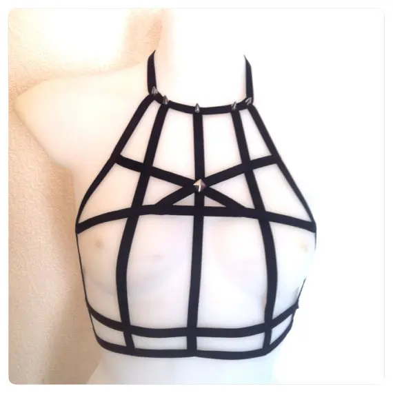 2016 new pastel goth pentagram chest bondage belt cage bra burlesque chest lingerie top Black Satin elastic strap studded retail