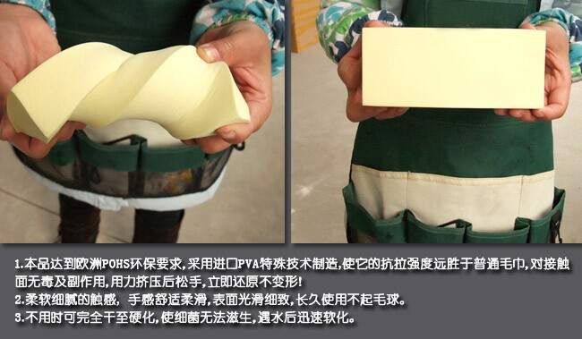 4. PVA imported special technology, making it far better than the tensile strength of any ordinary sponges and towels, and the contact surface of toxic side effects were hard lumps when dry to prevent bacteria invasion and reproduction.