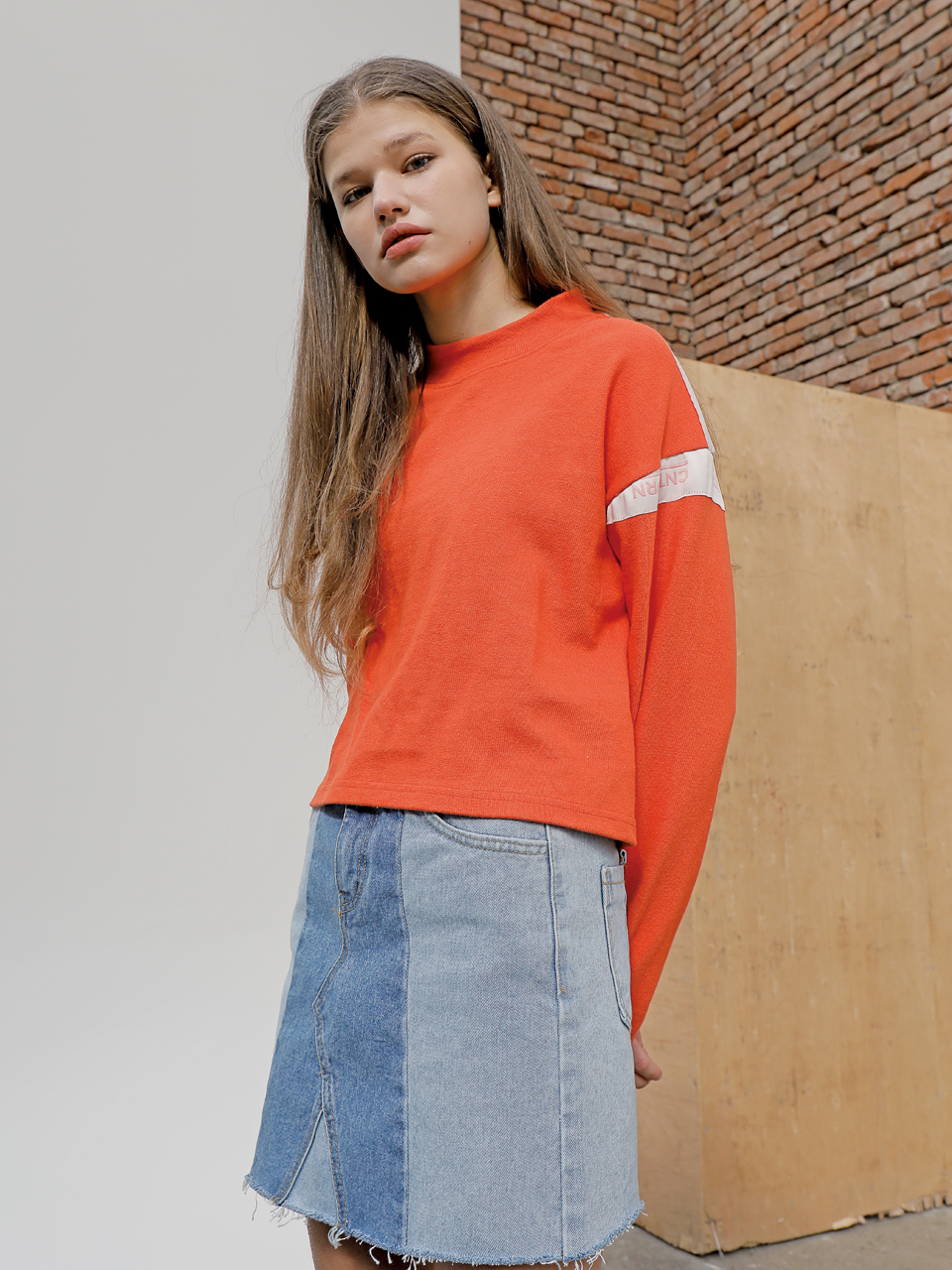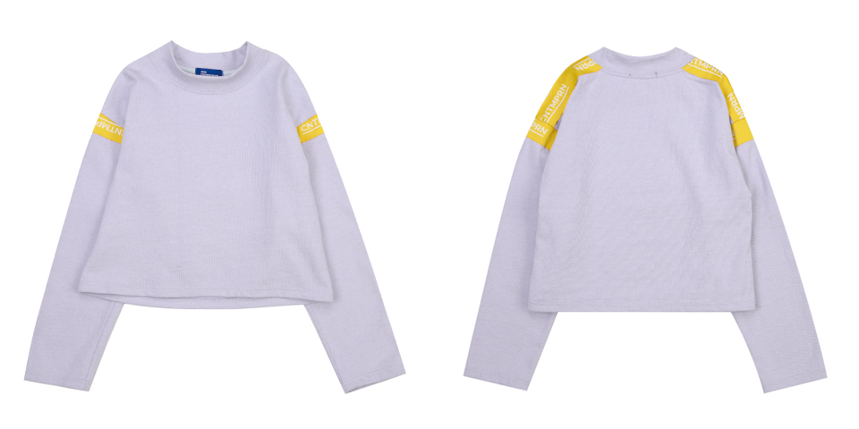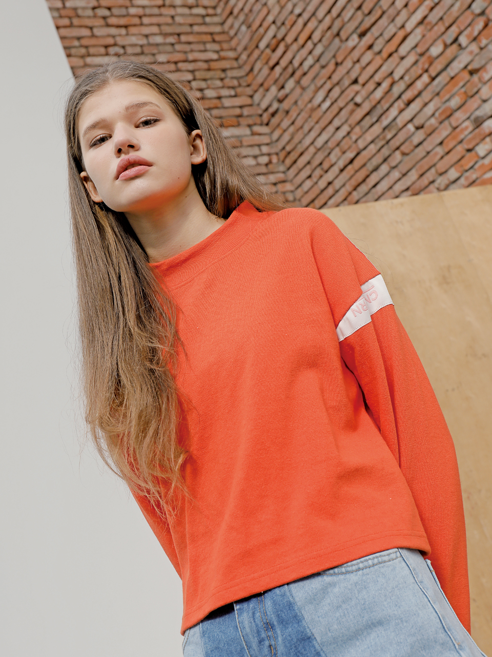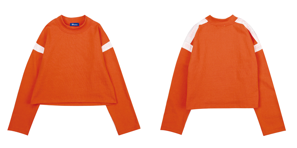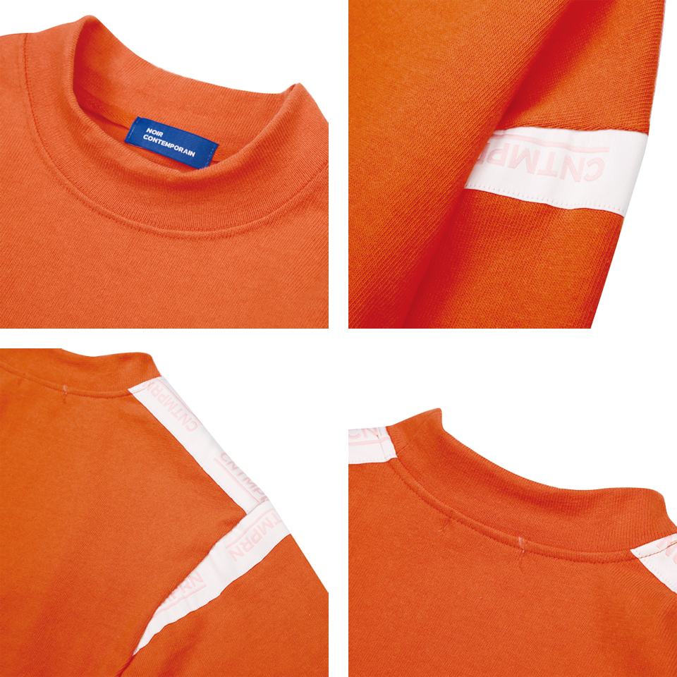 미니멀한 디자인의 コットン 티셔츠입니다. 어깨와 암홀 라인 상단에 로고 테이프가 수직으로 교차하도록 디자인되어 있습니다. 오렌지, 라일락 두 가지 カラー으로 출시되었습니다.