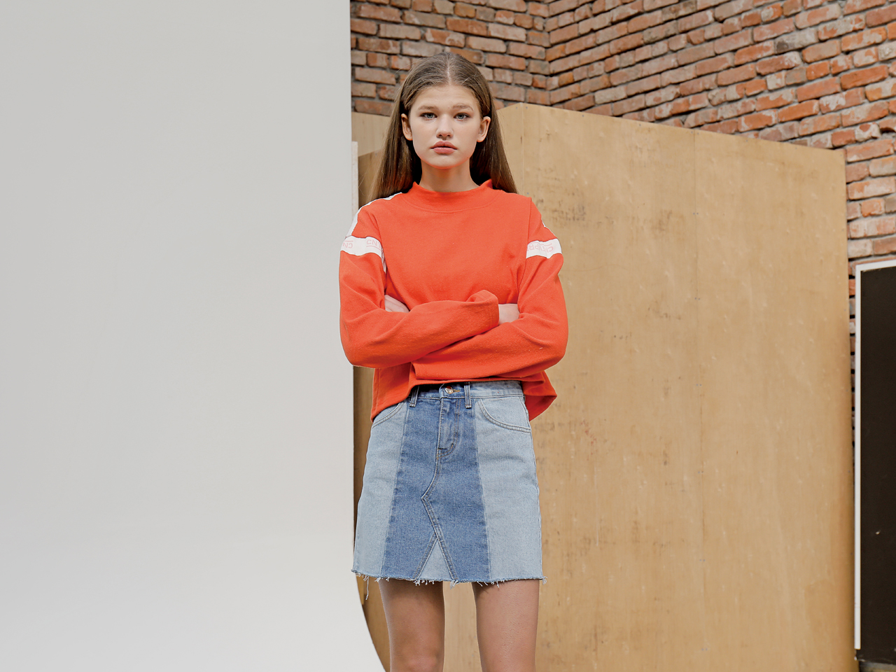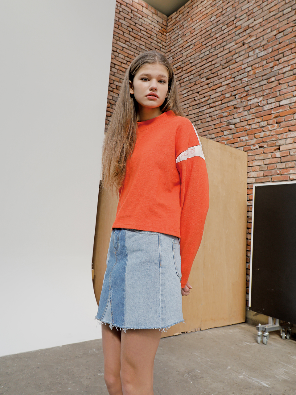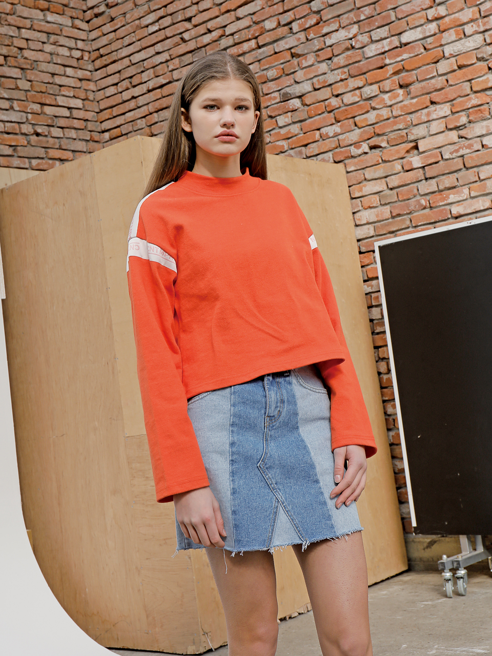 미니멀한 디자인의 コットン 티셔츠입니다. 어깨와 암홀 라인 상단에 로고 테이프가 수직으로 교차하도록 디자인되어 있습니다. 오렌지, 라일락 두 가지 カラー으로 출시되었습니다.