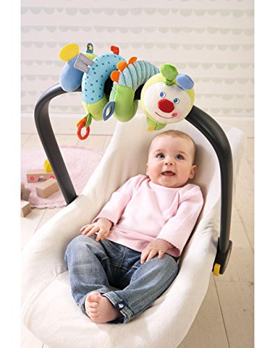 - This friendly worm mobile twines perfectly around your baby’s car seat handle, providing cheerful fun during journeys. It also can be fixed around the crib railing.