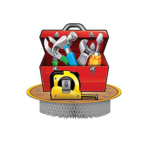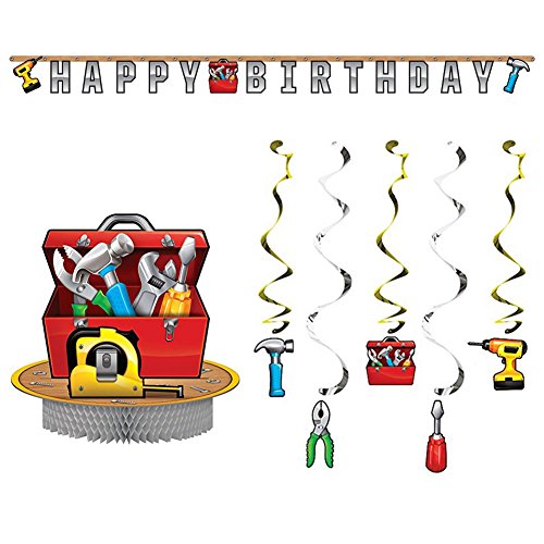 -. Title : Handyman Party Pack: Jointed Banner, Dizzy Danglers, and Honeycomb Pop-Up Centerpiece