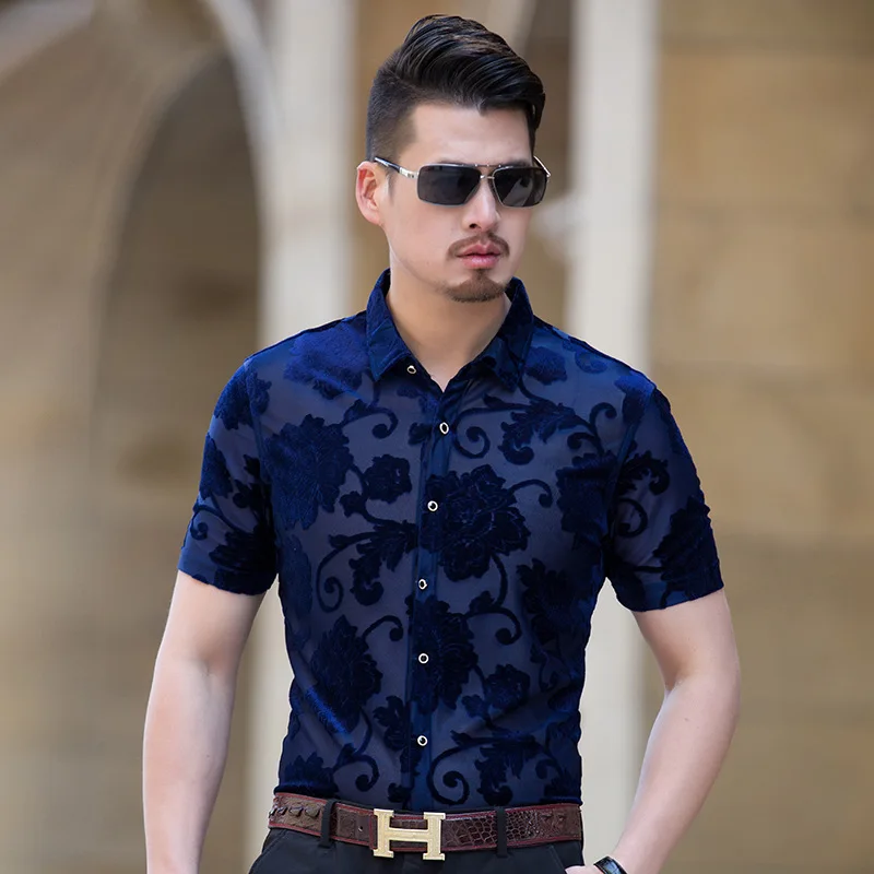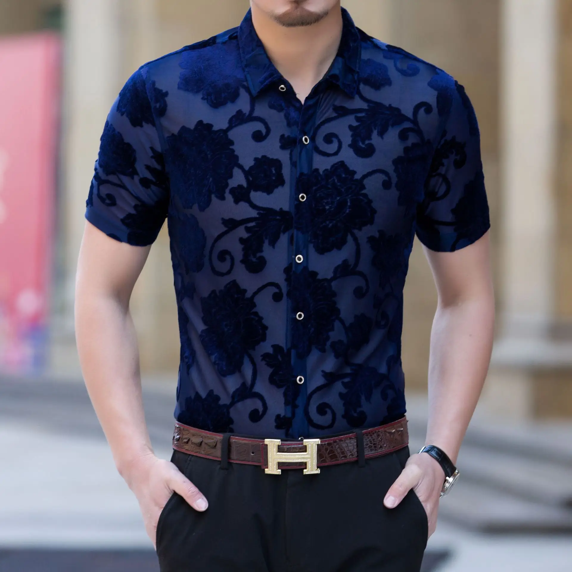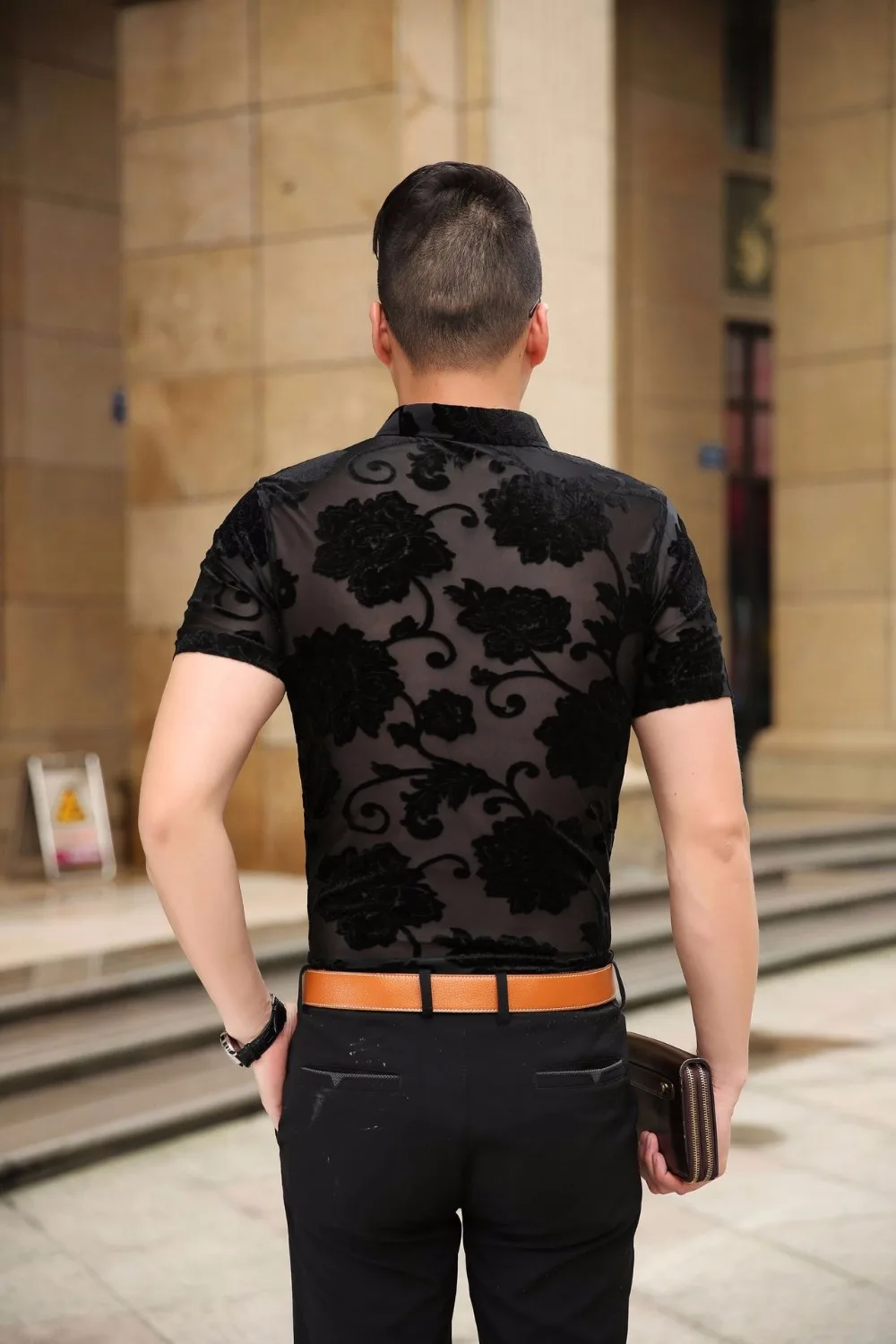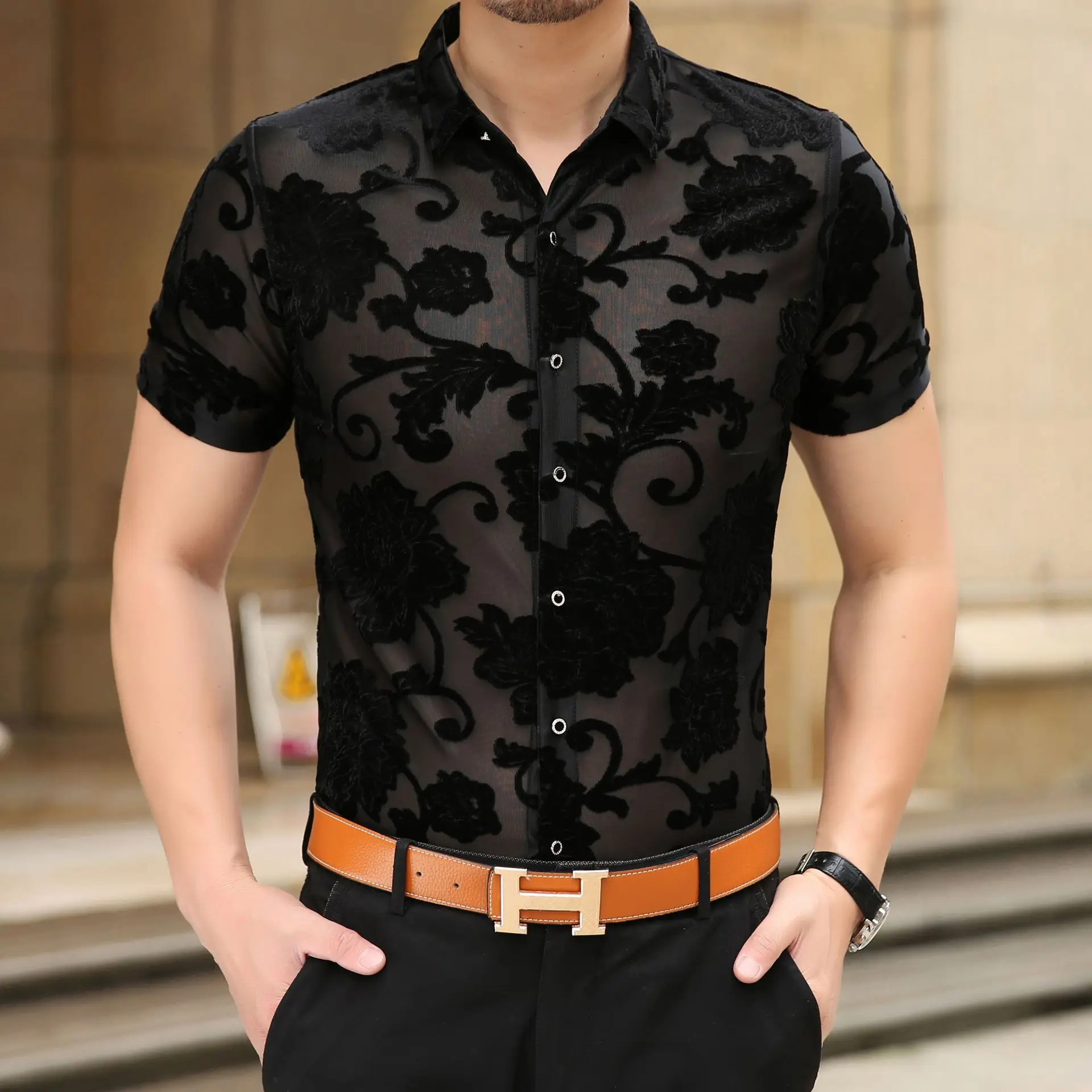 style:Sexy Lace Shirt,flowers lace shirt,mesh shirt men