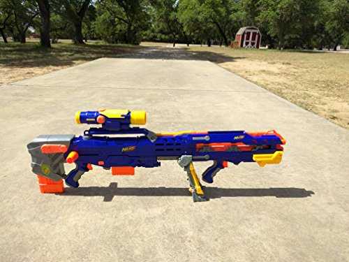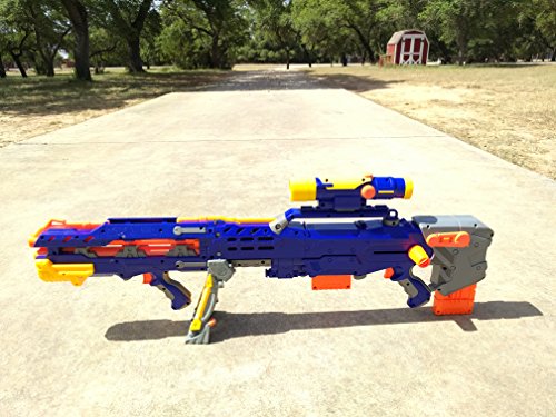 -. Feature : 2 blasters in 1 - bolt-action blaster and extension blaster / Combine into 1 blaster or separate into 2 blasters / Adjustable stock and targeting scope, Fold-down bipod / Includes quick-reload clip, Front Blaster Gun, and Scope / Blaster is more than three feet long