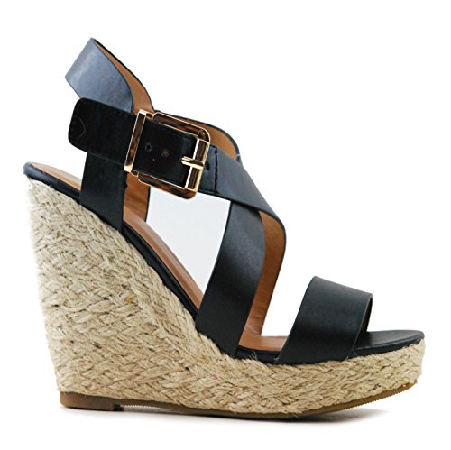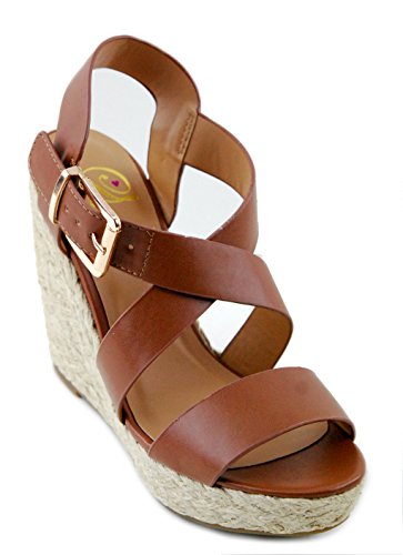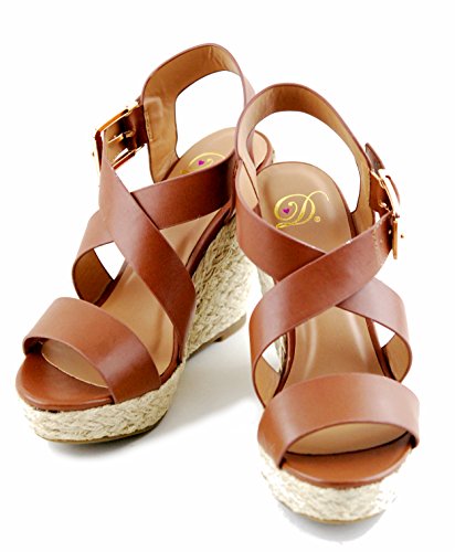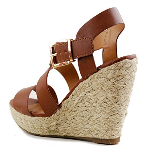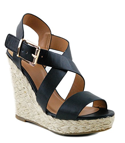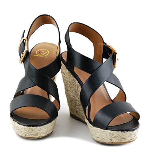 - Feature : Heel Height: 4 " wedge Heel (Approx) 1.25" Front platform (Approx) / Colors: Black / Dark Tan / Man made leatherette material upper / Open toe front with straps / Espadrille wedge with platform Summer Sandals