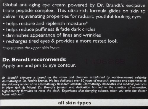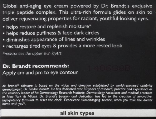 -. Binding : Health and Beauty -. Brand : dr. brandt -. EAN : 0663963004234 -. Feature : dr / brandt do not age triple peptide eye creams exclusive triple peptide complex rejuvenates, illuminates, and reverses signs of aging / Tthis ultra-rich formula glides on to helps restore and replenish moisture while reducing puffiness and fading dark circles -. IsAdultProduct : 0 -. Label : Dr. Brandt -. Manufacturer : Dr. Brandt -. Model : 100000000423 -. MPN : CDI-067 -. NumberOfItems : 1 -. PackageQuantity : 1 -. PartNumber : CDI-067 -. ProductGroup : Prestige Beauty -. ProductTypeName : LUXURY_BEAUTY -. Publisher : Dr. Brandt -. ReleaseDate : 2015-02-01 -. Size : .5 oz -. Studio : Dr. Brandt -. Title : dr. brandt Do Not Age with dr. brandt Triple Peptide Eye Cream, 0.5 fl. oz. -. UPC : 663963004234