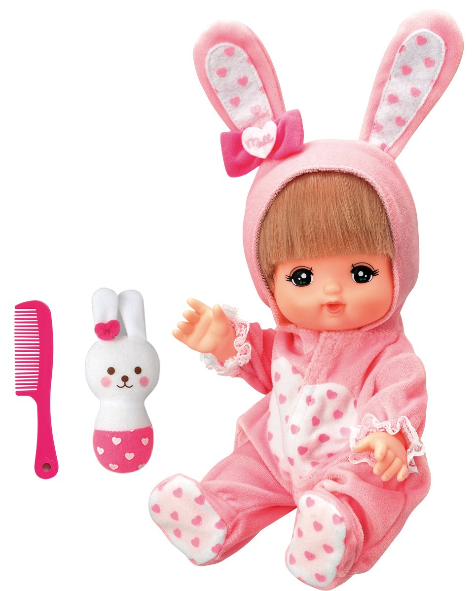 うさぎの耳のついたとってもかわいいロンパースを着たメルちゃんです!ガラガラとくしもついて、おせわごっこ遊びがすぐはじめられます。 対象年齢:1歳6ヶ月から 電池:不要
