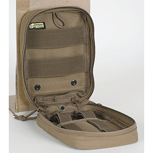 -. Feature : Securely holds your first aid kit, including a battle dressing or blood stopper kit / Pouch is empty / Fits on your MOLLE compatible tactical vest or chest rig, gear bag, belt, or other equipment / 7" tall x 5" wide x 2-1/2" deep.