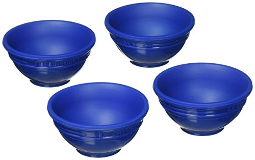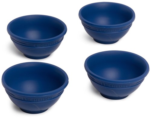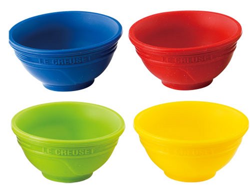 Whether measuring and staging loose ingredients before cooking or serving sauces, dips, and salsas on the side at dinner, this set of four 1/4-cup Silicone pinch bowls adds color, convenience, and versatility to any countertop or table. Crafted from stain-resistant, non-abrasive Silicone, the bowls resists odor and flavor absorption and can withstand heat up to 482-degrees F (250-degrees C). They're also safe to use in the microwave, oven, refrigerator, and freezer. Available in black and white, single-colored, or multi-colored, the pinch bowls provide countless uses in the kitchen and at the table. and like all Le Creuset Silicone, the bowls clean up easily with a simple cycle through the dishwasher. Stacked together, the bowls measure approximately 2-2/5 by 2-2/5 by 4-1/2-Inch.Feature
