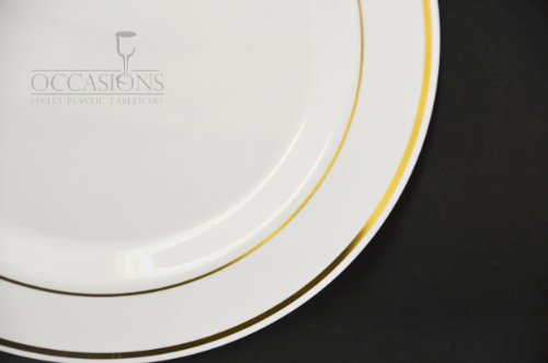 " OCCASIONS " 120 PACK, Heavyweight Disposable Wedding Party Plastic Plates (6'' Dessert / Bread Plate, White / Gold Rim)