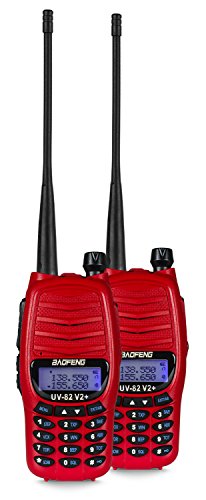 2-Pack Baofeng Red UV-82 V2+ Tri-Power (1/4/7w) Dual-Band 136-174/400-520 MHz Dual PTT Hand Held Ham Radio Two-Way Transceiver FCC Cert. – With Battery, Earpiece, Antenna Charger, and More