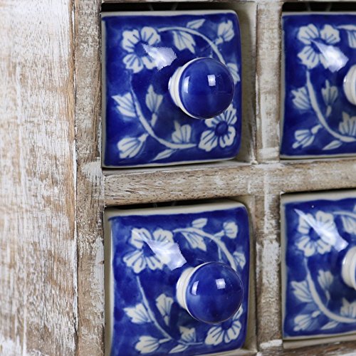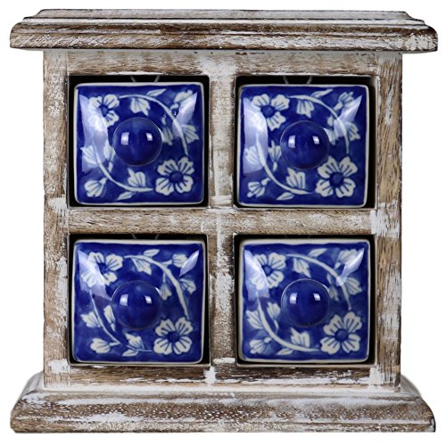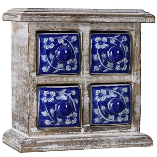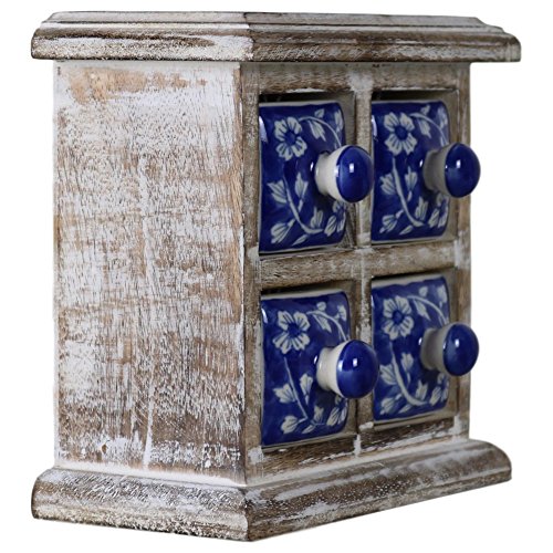 4 Drawer Ceramic Desktop Mini Chest of Drawers Jewellery Wood Wooden Blue White Box Cabinet