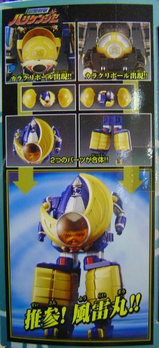 인풍전대 허리케인저장치 볼 시리즈에『풍뇌호』가 라인업 되었습니다.풍뇌호를 2개로 분해하고, 장치 볼에 저장.별매의 DX선풍신,DX굉뇌신에 수납에 옵니다.풍뇌호,DX선풍신,DX굉뇌신의 3개의 로보가 합체! 굉뇌 선풍신이 완성입니다.부속 미행 메달은 별매의 해리 켄 쟈이로나《고우라이친쟈》에 장착 가능합니다.