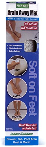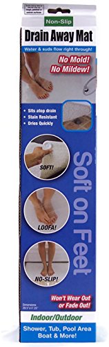 Drain Away Mat can be used in the shower, tub, pool area, boat & more! Water & suds flow right through it! Features a soft suction cup. Dimensions are 29.5" x 17.25". Not intended for use on rough, pebbled or uneven surfaces.