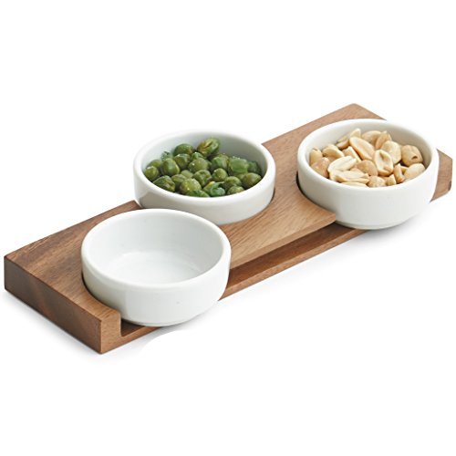 - Set comes with 1x acacia wood tray and 3x ceramic pinch bowls