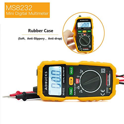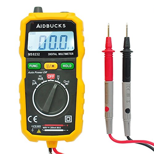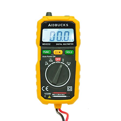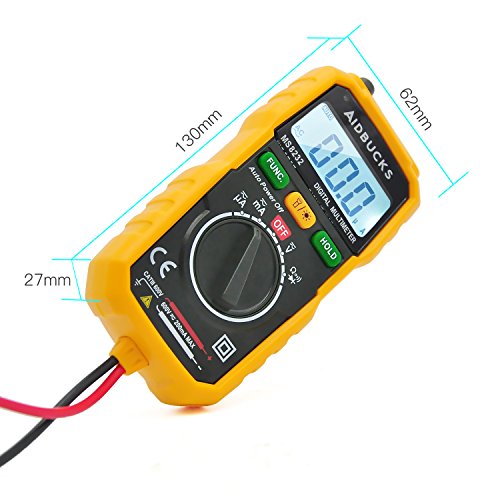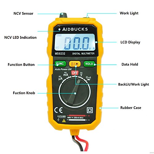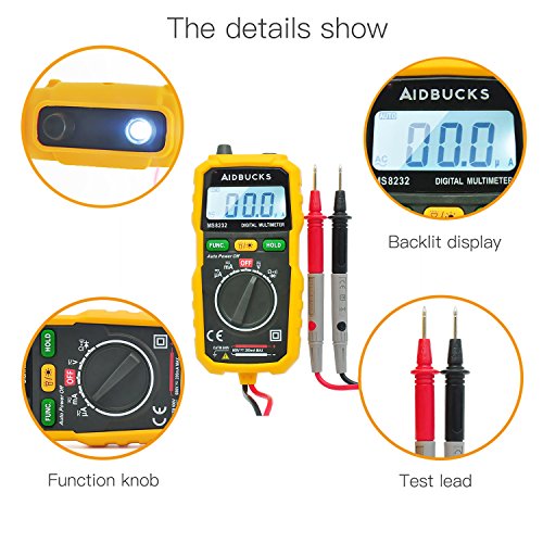 This Aidbucks portable Digital Multimeter is a practical tool for electricians, hobbyists, and general household use. It is easy to operate and features many different functions for measuring AC & DC voltage, DC current, and resistance, as well as continuity, transistor, and diode testing. It can be used to diagnose, assemble, and repair circuitry and wiring. Other features include a low battery indicator, easy-to-read backlit LCD, data hold, and overload protection.Feature
