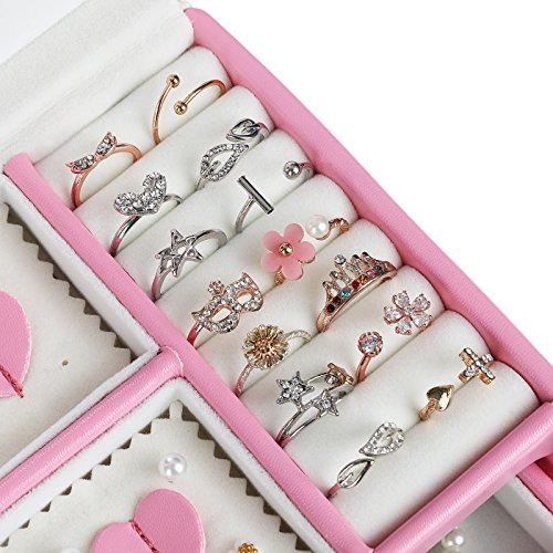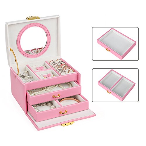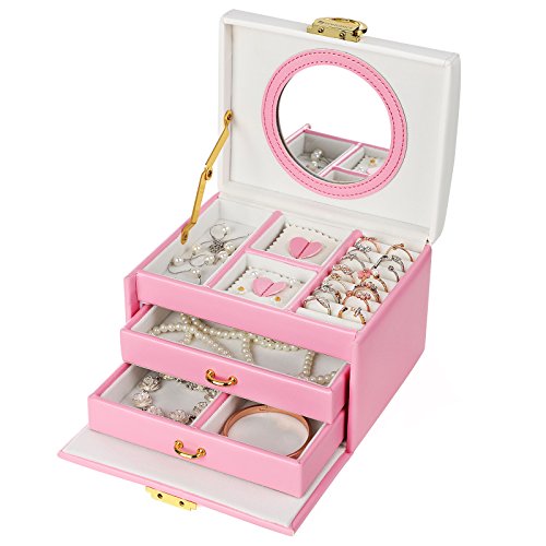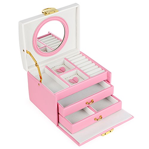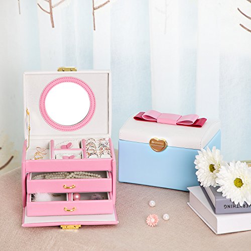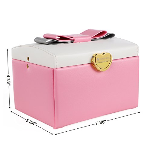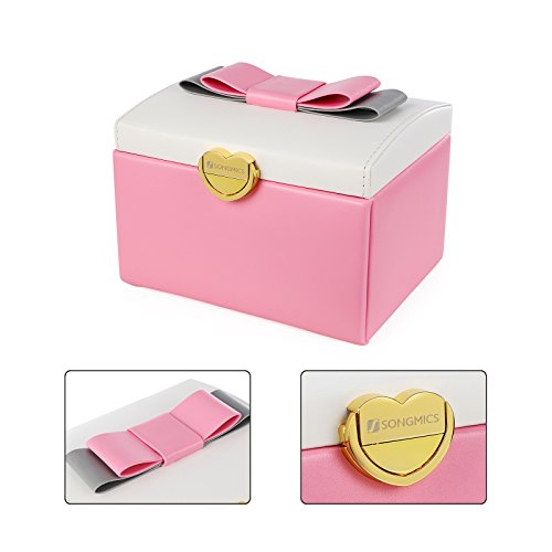 SONGMICS Jewelry Organizer with Bowknot Mirrored Storage Box Compact Travel Case Gift for Kids Girls and Women Pink and White UJBC115P
