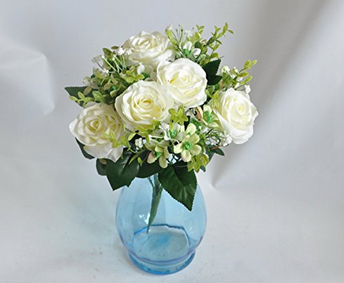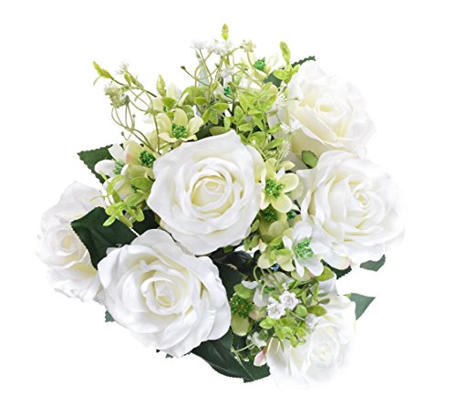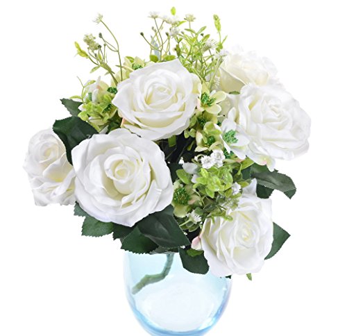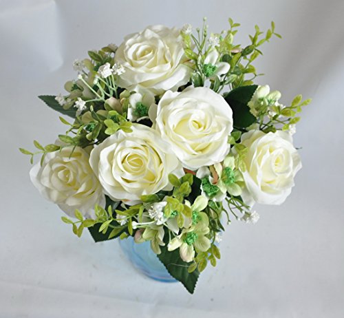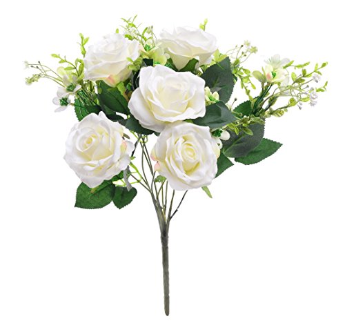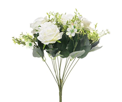 Artificial 17” Rose Flower Bouquet 12 Heads Flowers for Home Party Decorations Wedding Favors 6 Rose Flower and 6 Buds - White