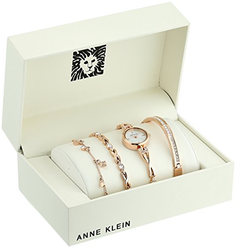 Whether given as a gift of kept for your own jewelry collection, the Anne Kline rose goldtone crystal watch box set dazzles and delights with its chic watch and trio of Swarovski crystal accented bracelets.