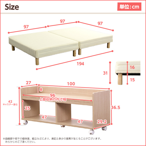 (ベッド)貼り材:ポリエステル クッション材:ボンネルコイル、ウレタンフォーム、フェルト、不織布 脚:木製脚15cm