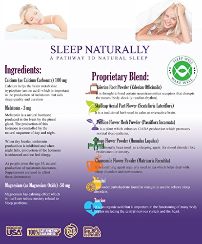 -. Binding : Health and Beauty -. Brand : Sleep Well Wake Well -. EAN : 0820103104197 -. Feature : RELAX AND DRIFT OFF TO SLEEP - It's like someone turned me off and flipped the switch. / WAKE UP FEELING REFRESHED AND READY TO TAKE ON THE DAY- Improves your mood unlike Prescription Pills. / SLEEP NATURALLY is made with Calcium, Magnesium and a Powerful ALL NATURAL Proprietary Blend. / FREE E-BOOK: "Improved Sleep=Improved Life: Tips for Better Quality ZZZs" / Hit the ADD TO CART button above! Remember to order 2: one for you and one for a friend! -. IsAdultProduct : 0 -. Label : Sleep Well Wake Well -. Manufacturer : Sleep Well Wake Well -. ProductGroup : Health and Beauty -. ProductTypeName : HEALTH_PERSONAL_CARE -. Publisher : Sleep Well Wake Well -. Studio : Sleep Well Wake Well -. Title : Sleep Naturally - Sleep Aid w/ Melatonin - Non Addictive Sleeping Pills with a Free E-book - Natural Valerian Root Chamomile Get Deeper More Restful Sleep -Sleep Remedy Aids a Better Sleep Cycle - 60 Vegetarian Capsules - 90 Day Money Back Guarantee -. UPC : 820103104197