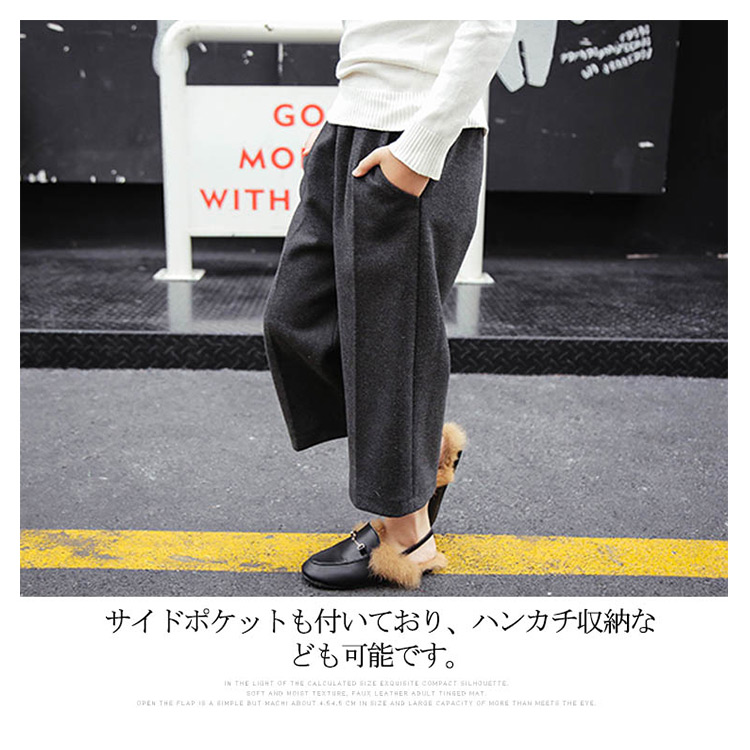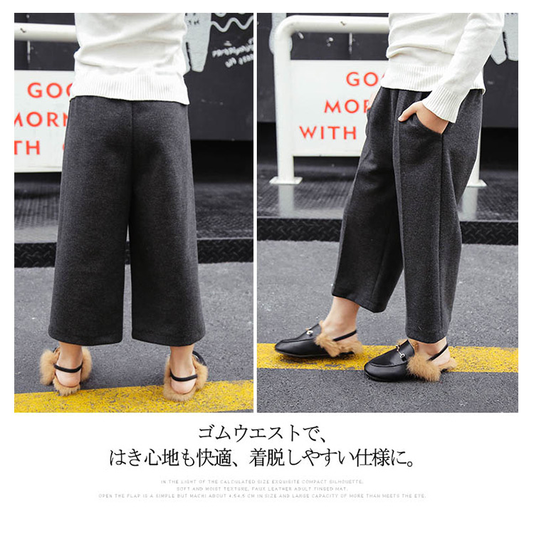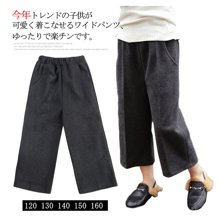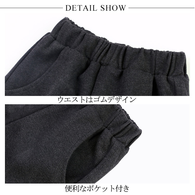 | 今年トレンドの子供が可愛く着こなせるワイドパンツ、ゆったりで楽チンです。厚手でしっかり生地、秋冬のお出かけにぴったりコーデ。ゴムウエストで、はき心地も快適、着脱しやすい仕様に。サイドポケットも付いており、ハンカチ収納なども可能です。 | |