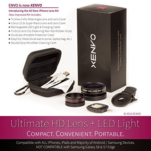 -. Feature : ✔ TRU-VIEW WIDE ANGLE LENS - Capture stunning and sweeping views of your everyday moments. The TRU-VIEW 0.45x Professional-Grade Lens gives you the power to capture 45% MORE PICTURE than your phone's built in lens WITHOUT sacrificing quality. Fantastic for photographing people, pets, landscapes, cityscapes, building interiors & exteriors, and any situation you can imagine where you need "More Picture" and bang for your buck. Plus, NO DARK CORNERS or vignetting like cheaper lenses. / ✔ CLARUS MACRO LENS - Marvel your senses with the 12.5x Super-Macro Lens attachment. Capture super close-ups that you simply can't get with your phone's built in lens. See all the intricacies and details of your favorite photo subjects with precision focus for sharp and clear pictures every time. / ✔ RECHARGEABLE LED FILL LIGHT - The included LED light plugs right into your phone's earphone jack and includes 3 settings: Low, Medium, and High. Instantly brighten your surroundings with warm continuous light. The warm and natural LED light is superior to your smartphone's built in flash - which often blinds people and yields unnatural color in your photos - especially in darker settings and venues. Say goodbye to frustrating photo "retakes" and hello to brilliant photos the first time. / ✔ TRU-GRIP LENS CLIP - The ENVO "TRU-GRIP" Lens Clip offers superior gripping power to STAY PUT on your phone. Just center the clip over your cell phone lens and you're ready to go at a moment's notice. The gripping surfaces of the clip are made of soft, yet firm and resilient rubber. Your iPhone and Android devices are safe from harm. No need to worry about wear and tear or losing your lens when you're in action mode, framing your next perfect shot. / ✔ PERSONAL & PROFESSIONAL PHOTOS & VIDEOS - Shooting "selfies" and large group photos is a snap. A huge hit at social gatherings and family outings. Also designed for today's most demanding content creators, bloggers, marketers, social media and video pros, who count on their smartphone camera to grow their online presence and business.