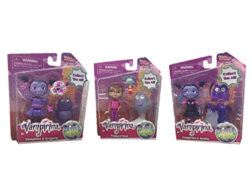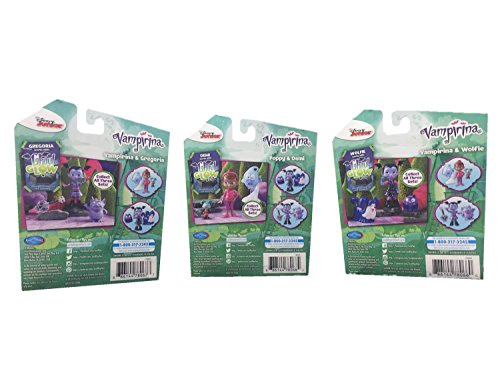 -. Binding : Toy -. Brand : Disney Junior Vampirina -. EAN : 0740647649766 -. Feature : Includes complete set of all 3 Vampirina Ghoul Glow figure sets / Includes 1 Vampirina & Gregoria with spookylele set / Includes 1 Poppy & Demi with franken-stacey set / Includes 1 Vampirina & Wolfie with backpack set / Figures range from 1.5 inches to 3 inches long and work with the Vampirina Glowtastic Friends Set (sold separately) -. Label : Just Play -. Manufacturer : Just Play -. MPN : 78065 -. PartNumber : 78065 -. ProductGroup : Toy -. ProductTypeName : TOYS_AND_GAMES -. Publisher : Just Play -. Studio : Just Play -. Title : Disney Junior Vampirina Ghoul Glow Figure Set Bundle with Vampirina & Gregoria, Poppy & Demi, and Vampirina & Wolfie -. UPC : 740647649766