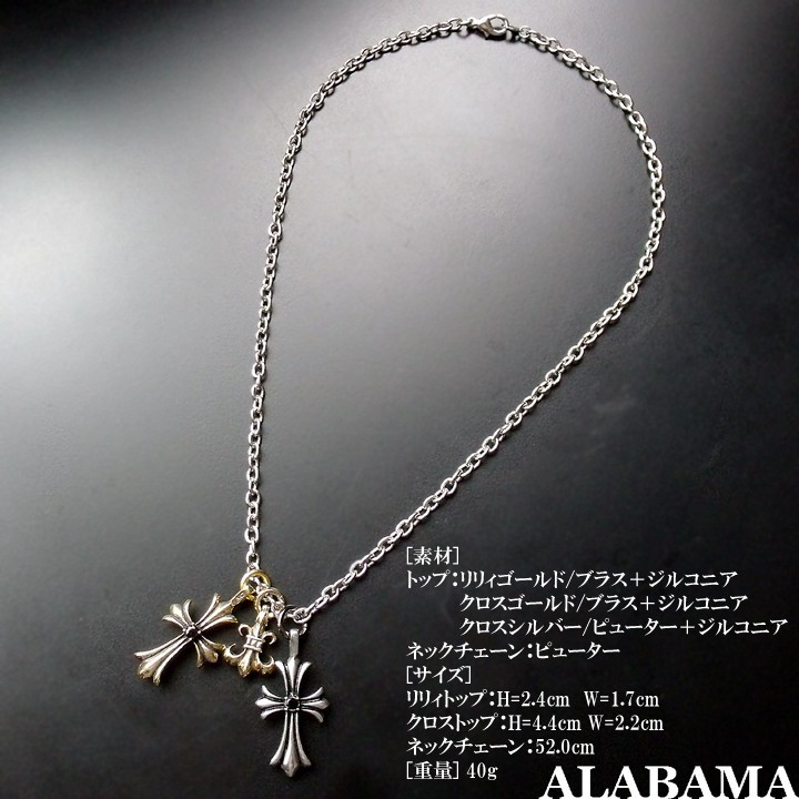ダブルクロス&リリィ ペンダントトップ ネックレス【素材】ペンダントトップ:ゴールド=ブラス製 シルバー=ピューター製 ネックチェーン:ピューター製【サイズ】ネックチェーン:約52.0cm クロストップ:H=4.4cm W=2.2cm リリィトップ:H=2.3cm W=1.7cm 【重量】約40g【仕様】詳細画像に記載してます。【Deep Zone】ワイルドでセクシーを上品にまとめる男のアクセサリーブランド。自分買いからプレゼントにも人気でオススメアイテムです。