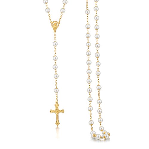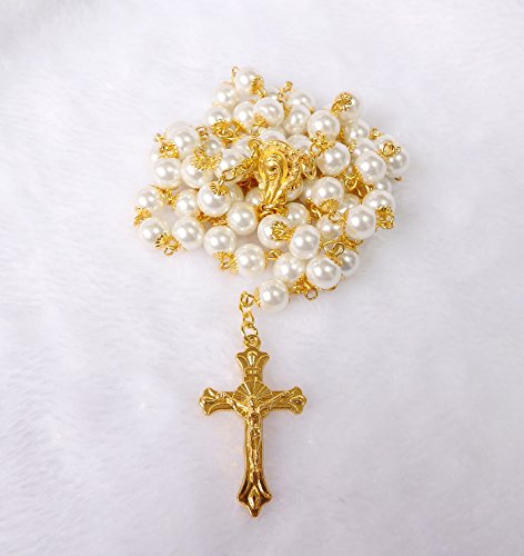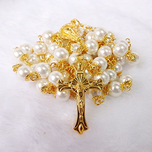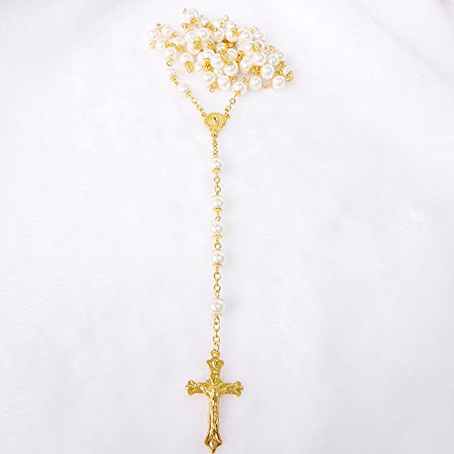 -. Feature : Catholic Imitation pearls beads Rosary Necklace / Necklace Perimeter: 35.43'', Pendant Length: 6.5'', Beads diameter:2.8'' / Rosary Necklace White Pearls Beads Golden Chain Necklace With Metal Crucifix / Beautiful Rosary Necklace.This is good as a gift.Free gift packing.