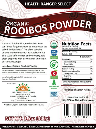 -. Binding : Misc. -. Brand : NN STORE -. EAN : 0029882516348 -. Feature : Sports REcovery / Redbush Tea / The plant contains unique antioxidants such as aspalathin. / Product of India. Certified organic by CCOF -. IsAdultProduct : 0 -. LegalDisclaimer : "Rooibos powder makes an oustanding sports recovery drink, or even a nice warm tea. The phytonutrient profile of rooibos is unique and includes aspalathin. There is NO caffeine in rooibos! I like to use this to make cold drinks on a hot summer day, or even a warm tea for winter. Add goji berries to the warm tea for a really delicious combination tea." - Mike Adams, the Health Ranger Native to South Africa, rooibos has been consumed for generations as a nutritious tea called "redbush tea." The plant contains unique antioxidants such as aspalathin. It's also 100% caffeine-free and very tasty. It is often prepared with a sweetener to make a delicious beverage. Product of India. Certified organic by CCOF. -. ProductGroup : Grocery -. ProductTypeName : GROCERY -. Title : Rooibos Powder - Health Ranger Select (100 Gram) -. UPC : 029882516348