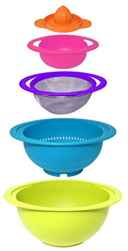 - Set Includes: Large Mixing Bowl, Colander, Sifter, Small Mixing Bowl, and Juicer