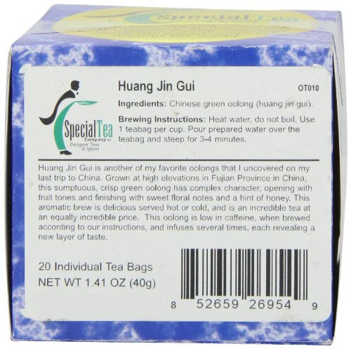 -. Binding : Grocery -. Brand : Special Tea -. EAN : 0852659269549 -. Feature : 20 superior tea bags per box. Your favorite whole loose tea leaves are freshly ground, gently sealed in oxygen bleached tea bags and conveniently boxed so every cup is easily brewed and absolutely delicious. / Quality loose teas. Whole loose tea leaves have all their essential oils intact, so the flavor, quality and health benefits are maintained. / Award-winning teas. The competitive World Tea Championships and North America Tea Championships have recognized many of our teas as the highest quality and best tasting teas in their categories. / Sealed in foil bags for freshness / Each box of tea is handmade in the USA -. Label : Special Tea Company -. Manufacturer : Special Tea Company -. Model : 852659269549 -. MPN : 852659269549 -. NumberOfItems : 1 -. PackageQuantity : 1 -. PartNumber : 852659269549 -. ProductGroup : Grocery -. ProductTypeName : GROCERY -. Publisher : Special Tea Company -. Studio : Special Tea Company -. Title : Special Tea Gourmet Oolong Tea Bags, Huang Jin Gui, 20 Count -. UPC : 852659269549