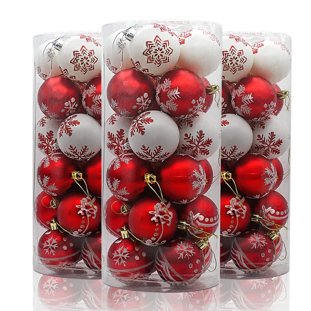 ❉直径6cmのレッドとホワイトのプラスチックボールオーナメント24点セット。6種のデザインが入ったおしゃれな組み合わせです。