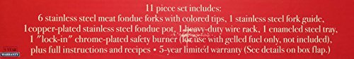 - Set Includes: 6 Stainless Steel meat fondue forks with colored tips, 1 stainless steel fork guide, 1 copper plated stainless steel fondue pot, 1 heavy duty wire rack, 1 enameled steel tray, 1 lock-in chrome plated safety burner, instructions and recipes