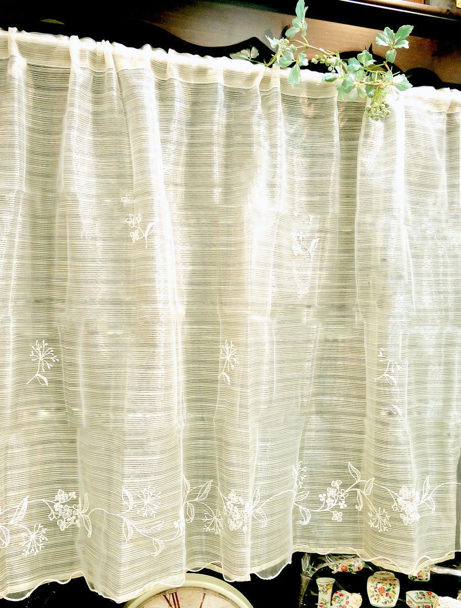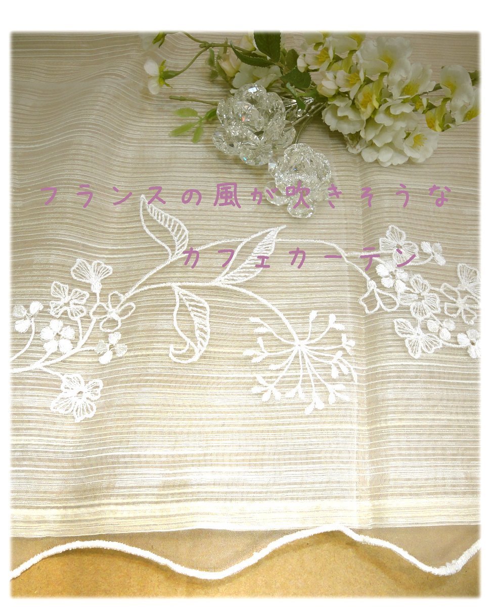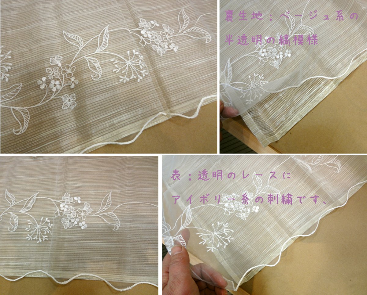 It is a double cafe curtain which is attractive with sheer feeling by overlapping transparent laces with embroidery based on ivory on a semi-transparent striped base fabric of glossy beige type.
