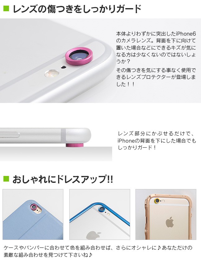 | 仕様 | iPhoneの突出したレンズ部分を保護する、レンズプロテクターです。 レンズ部分にはめ込むだけなので、誰でも簡単に装着が出来ます。 ケースやカバーのデザインに合わせてオシャレを楽しむのも◎♪ |
