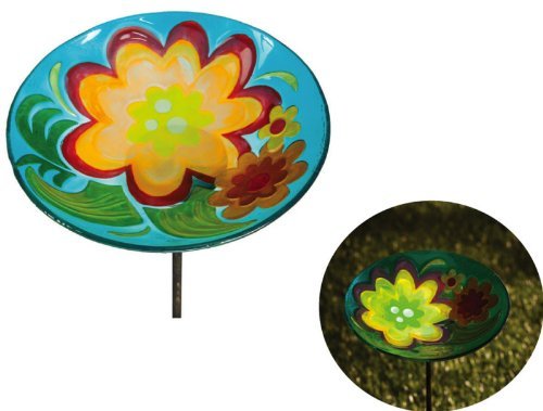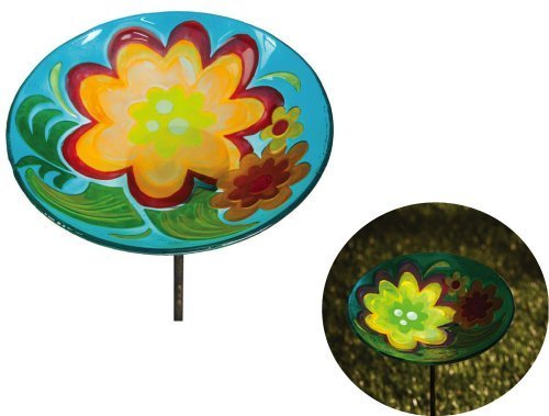 Product Description Top is made of glass;Garden stake is made of metal;Approximate dimensions are 9 x 9 x 24;Can be used as a bird bath or a small dish feeder 0