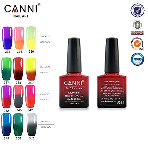 -. Binding : Health and Beauty -. Brand : CANNI -. Color : Magic -. EAN : 0603161634352 -. Feature : New Product Nail Art Design CANNI 7.3ml Soak Off UV/LED Gel polish Changing Color With 14colors / UV or LED lamp is required for these gel polishes / Magic of the uv color change nail gel : ( Hot-Cold ) -. IsAdultProduct : 0 -. Label : CANNI -. Manufacturer : CANNI -. PackageQuantity : 12 -. ProductGroup : Beauty -. ProductTypeName : HEALTH_PERSONAL_CARE -. Publisher : CANNI -. Size : 7,8ml -. Studio : CANNI -. Title : CANNI 7.3 ml UV Color Changing Gel Nail Polish, Set of 12 -. UPC : 603161634352