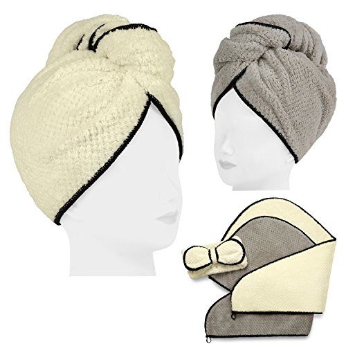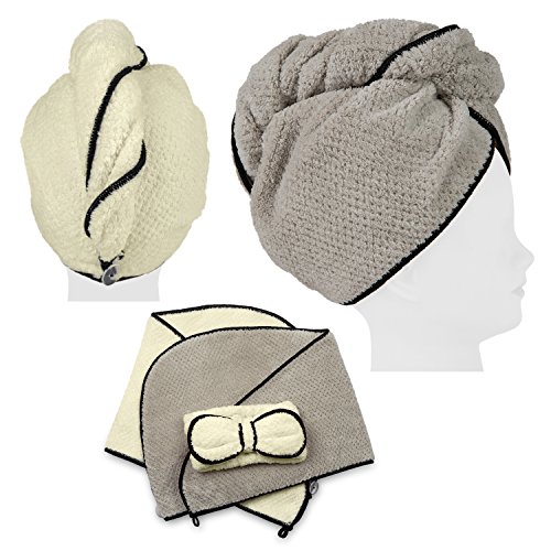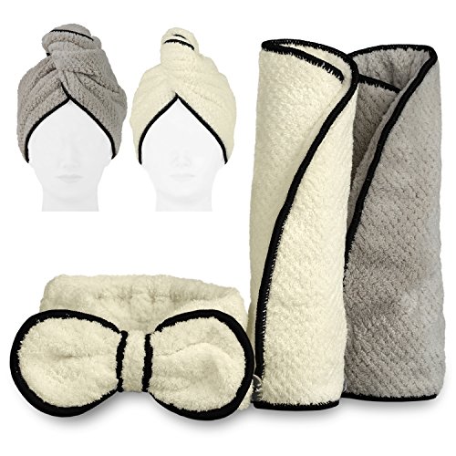 Luxeris Super Absorbent Hair Drying Towel Wrap(2 Pack) and Make-up Headband Set, Elegant Microfiber Anti-Frizz Hair Turban and Spa Hairband for Girls and Women