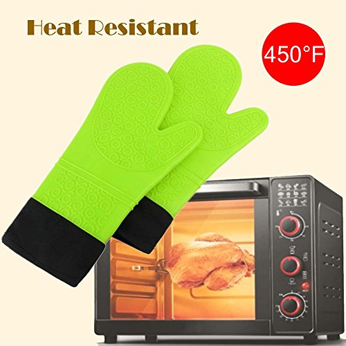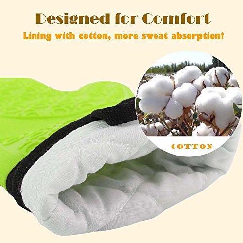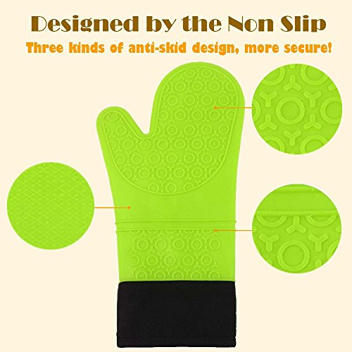Silicone Oven Mitts-Glamouric BBQ Grilling Gloves Potholders Up to 450°F Heat Resistant Quilted Cotton Lining Extra Long Non Slip Waterproof for Kitchen Cooking Roasting and Baking (1 Pair,Green)